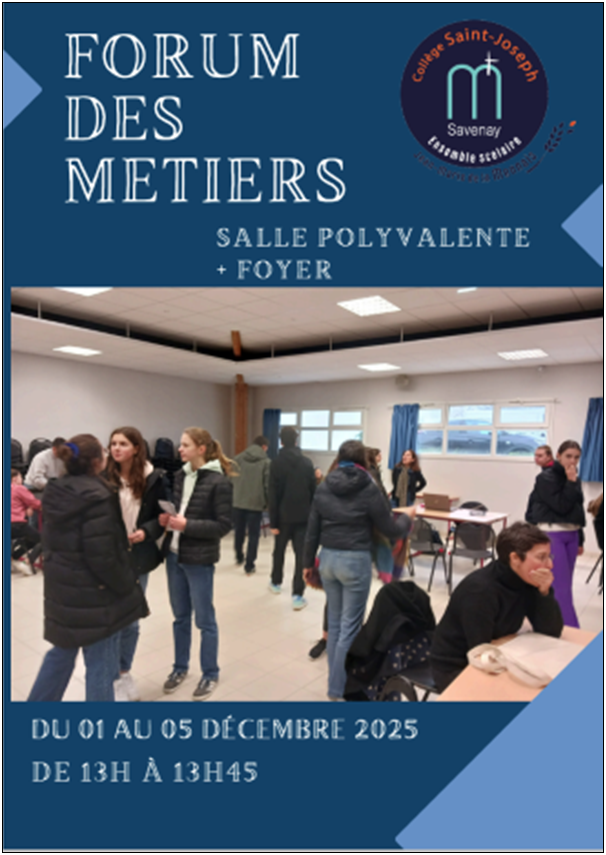 Durant la semaine du 1er au 5 Décembre, les élèves de 3ème ainsi que la 4D auront la chance de pouvoir assister au forum des métiers en salle polyvalente tous les midis. Des parents volontaires viendront présenter leurs professions afin de guider les jeunes dans leur choix d’avenir...