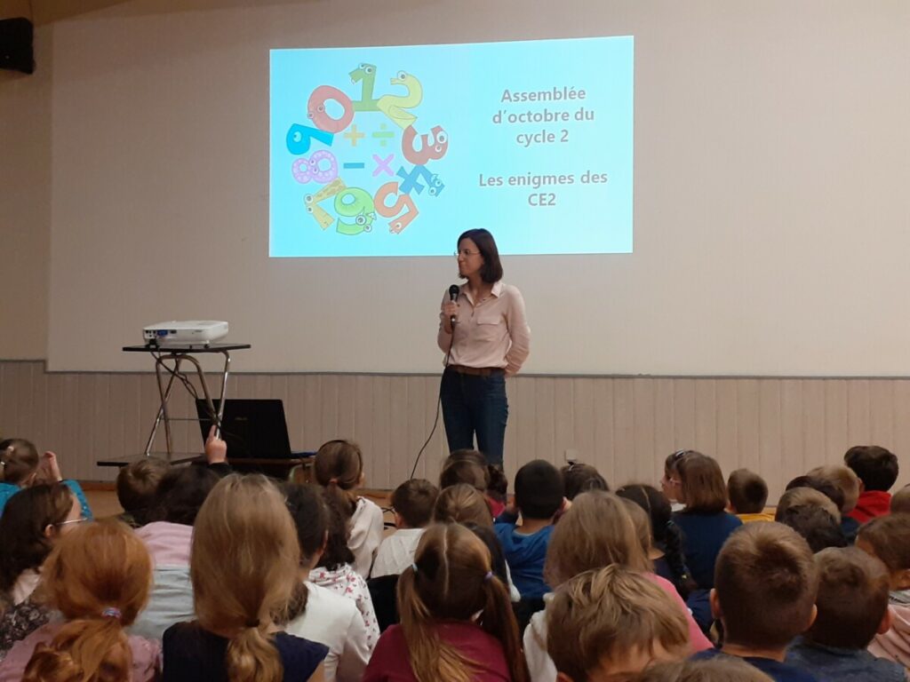 Vendredi 21 octobre, les 7 classes de cycle 2 se sont retrouvées à la salle de conférence afin de vivre leur 1ère assemblée de cycle de l’année. En lien avec le projet maths, des énigmes avaient été partagées entre les différentes classes. Durant ce temps, les propositions de réponses étaient formulées et elles étaient ensuite validées (ou pas) par les concepteurs des énigmes. Un chant sur les mathématiques a été interprété par l’ensemble des élèves. Pour certains, c’était l’occasion de prendre la parole avec un micro et devant plusieurs dizaines d’élèves. Un escape game a été vécu également dans plusieurs classes de cycle 2.