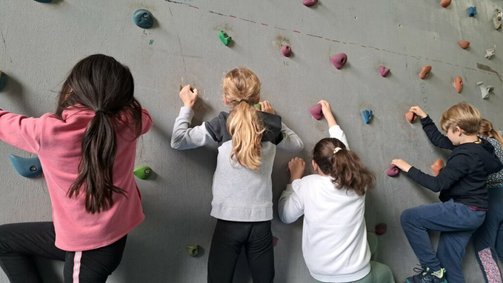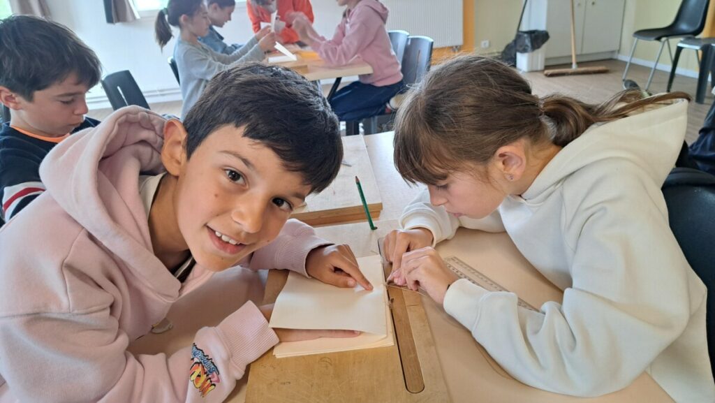 Le matin, inversion des activités de la veille : les CM2 A se sont initiés à l’art de la reliure du 16ème siècle et ont confectionné leur carnet de voyage. Quant aux CM2 B, ils ont découvert à vélo les divers chemins du domaine de la Turmelière et les joies de la grimpe sur un mur d’escalade.