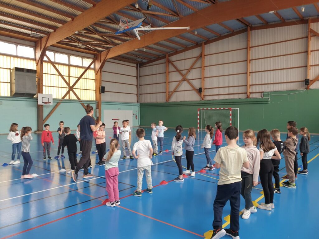 Encadrés par un animateur sportif, les CE1 B découvrent l’athlétisme : rapidité, vivacité et coopération sont les maîtres-mots !