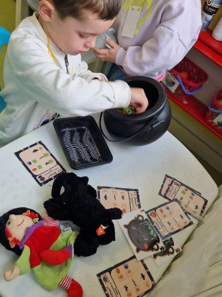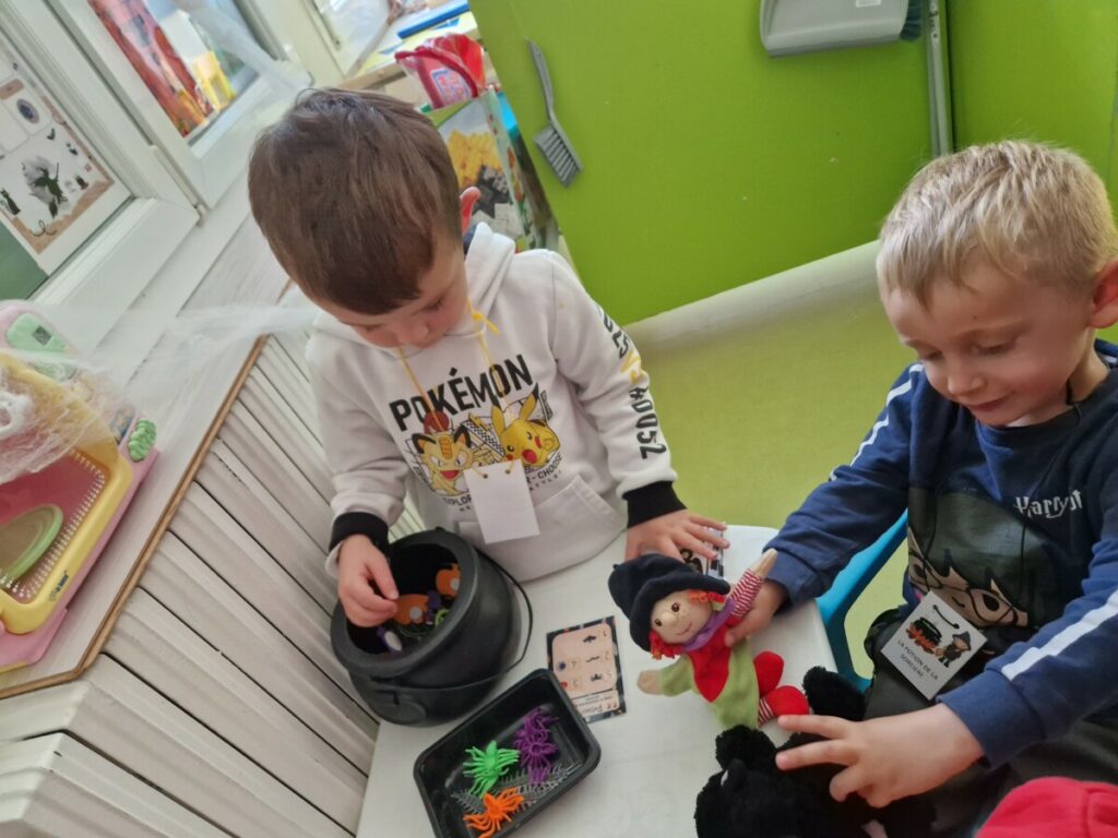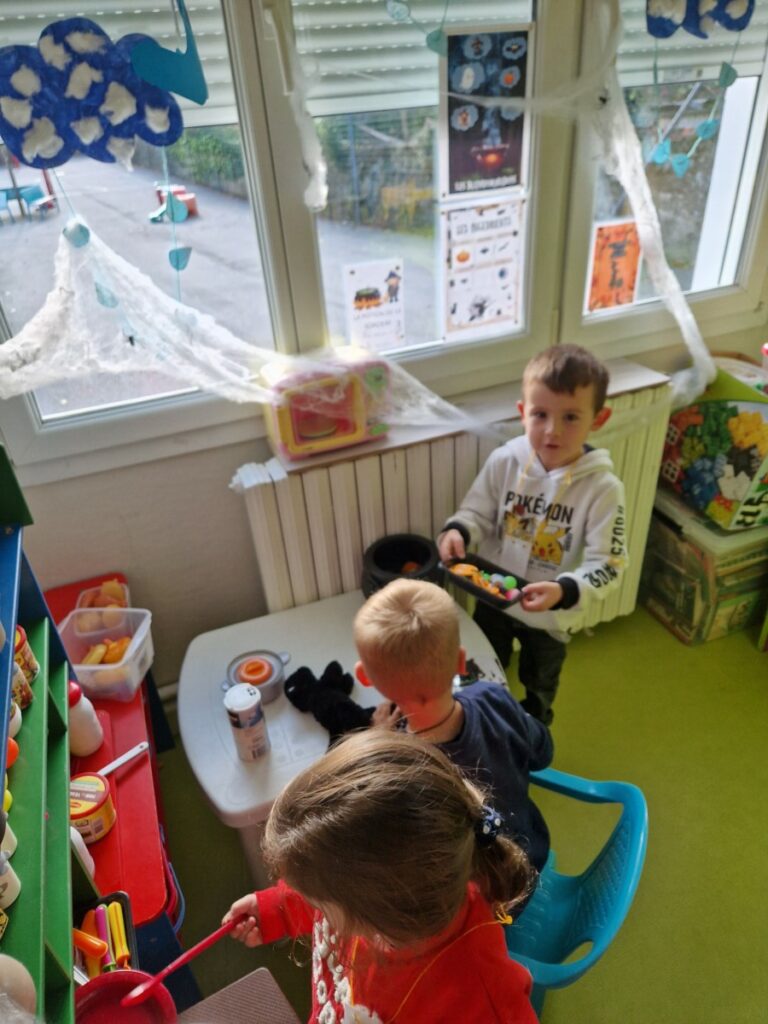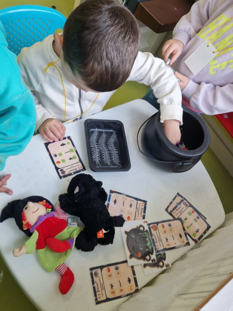 Cette rentrée nous avons découvert notre coin jeu quelque peu modifié… Une petite sorcière, nommée Pélagie, et son chat Rodolphe ont transformé notre coin cuisine en véritable laboratoire de potions magiques, pour notre plus grand bonheur… Interdit à Marie d’y faire le ménage, les toiles d’araignées et les araignées y sont de rigueur. Nous aidons Pélagie à réaliser des potions selon son grimoire : des yeux baveux, des ailes de chauve-souris, des mille-pattes… miam-miam !!! Bien sûr il ne