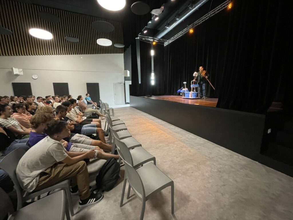 Vendredi 8 septembre, dans le cadre de la préparation au baccalauréat de français et du parcours PEAC, toutes les classes de 1ere ont assisté au lycée, au spectacle Augustin sans nom du théâtre de l’Entracte, basé à Nantes. Puis, s’en est suivi un bord de plateau avec le comédien afin d’échanger sur la pièce et sur les ressentis des lycéens.